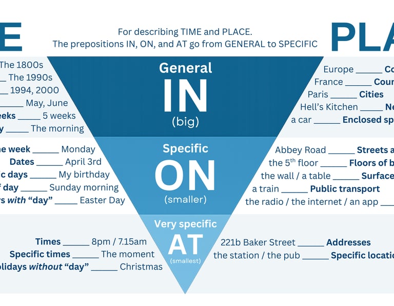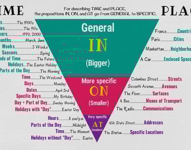 Prepositions can be one of the most difficult parts of the English language to get right. It might seem like there are so many rules and remembering them all feels like climbing a mountain! This little tool can help put everything in perspective. Feel free to download it for safe keeping!