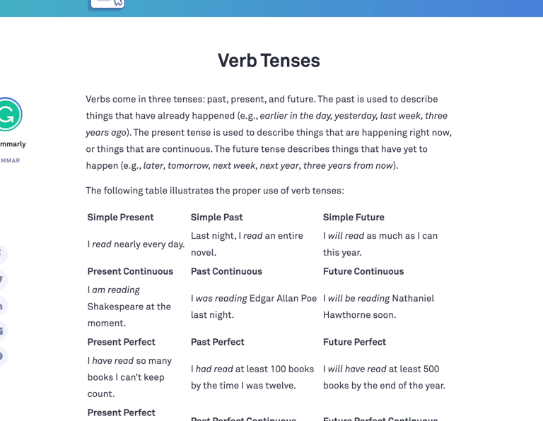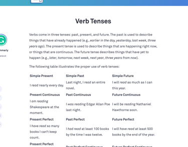 You might know Grammarly from their popular software to improve your writing. However their grammar blog is a fantastic place to find quick guides to different components of grammar written in an accessible and easy to understand way. In particular I really like their 'verb tenses' page.